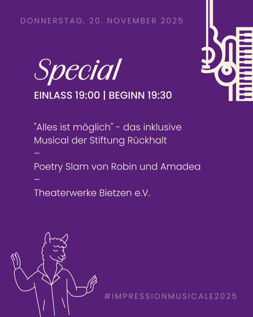 Auch in diesem Jahr dürfen Sie sich an unserem Special-Abend des 47. Impression Musicale auf Auftritte der besonderen Art freuen. Der Abend beginnt musikalisch mit dem inklusiven Musical „Alles ist möglich“ von der Stiftung Rückhalt. Spannend geht es weiter mit einem Poetry Slam von zwei Schüler:innen des IGI, Robin und Amadea. In den Pausen dürfen wir Sie mit unseren frisch zubereiteten Nudeln mediterraner Art kulinarisch verwöhnen. Zu guter Letzt schließen wir den Abend mit Improvisationstheater von den Theaterwerken Bietzen ab.