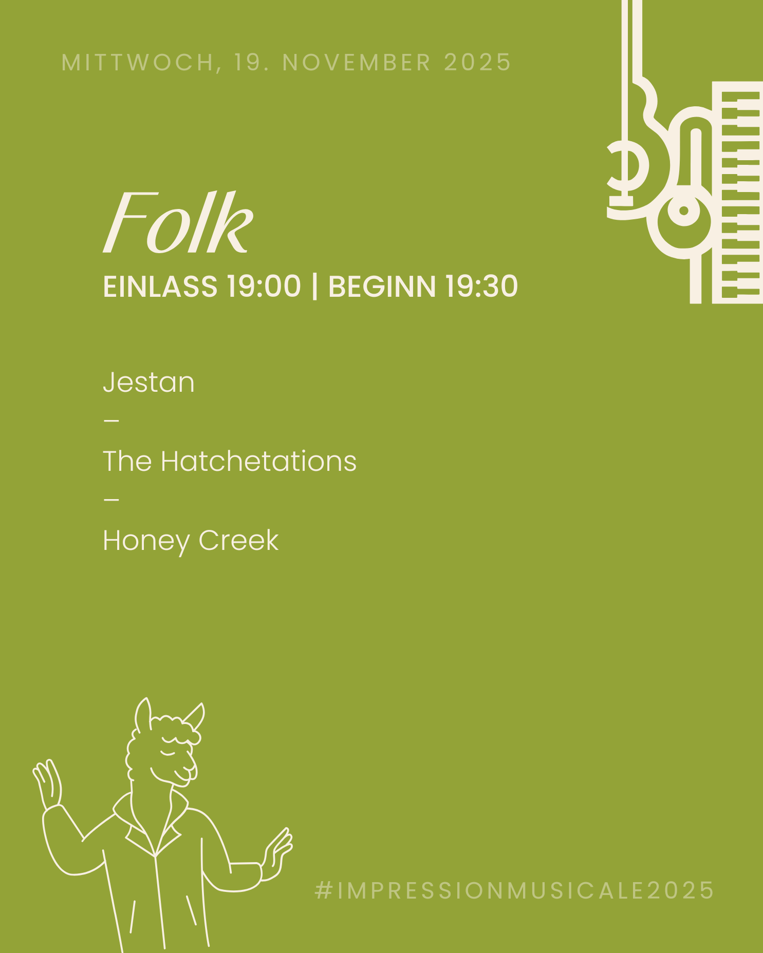 Am Impression-Mittwoch erwartet sie wie in jedem Jahr unser Folk-Abend. In diesem Jahr sorgen die Bands Jestan, The Hatchetations und Honey Creek für eine mitreißende Stimmung mit Irish-Flair. Lassen sie den Abend außerdem mit unseren selbstgemachten Flammkuchen und einem frisch gezapften Guinness entspannt ausklingen.