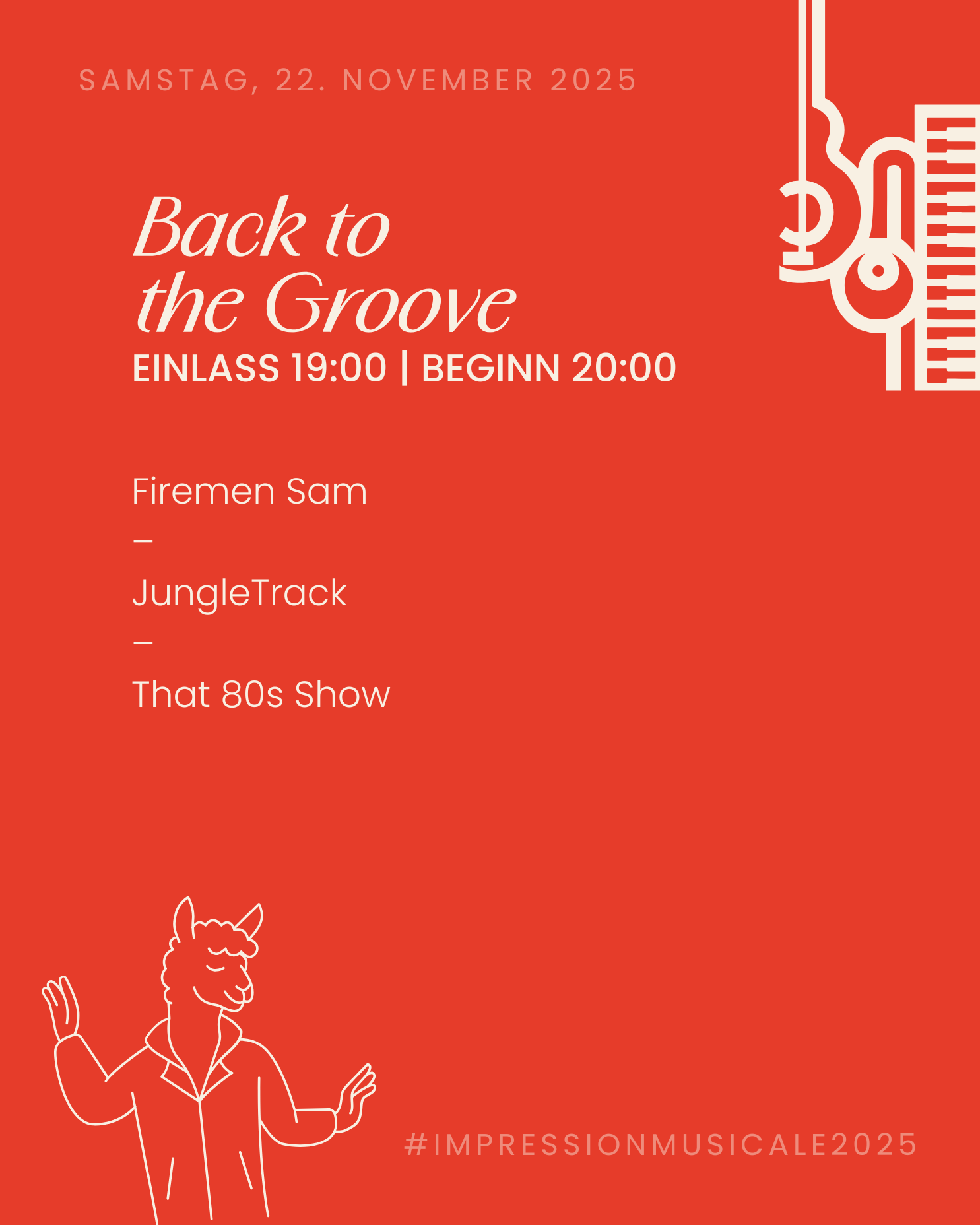 Am Samstag des diesjährigen Impression Musical heißt es wieder: Back to the Groove. Dabei werden die Bands Firemen Sam, JungleTrack und That 80s Show Sie ihre stressige Woche vergessen lassen, indem sie Sie ordentlich in Tanzstimmung bringen. Wie immer wird es auch dieses Jahr Rostwürste, Currywurst und Pommes geben!